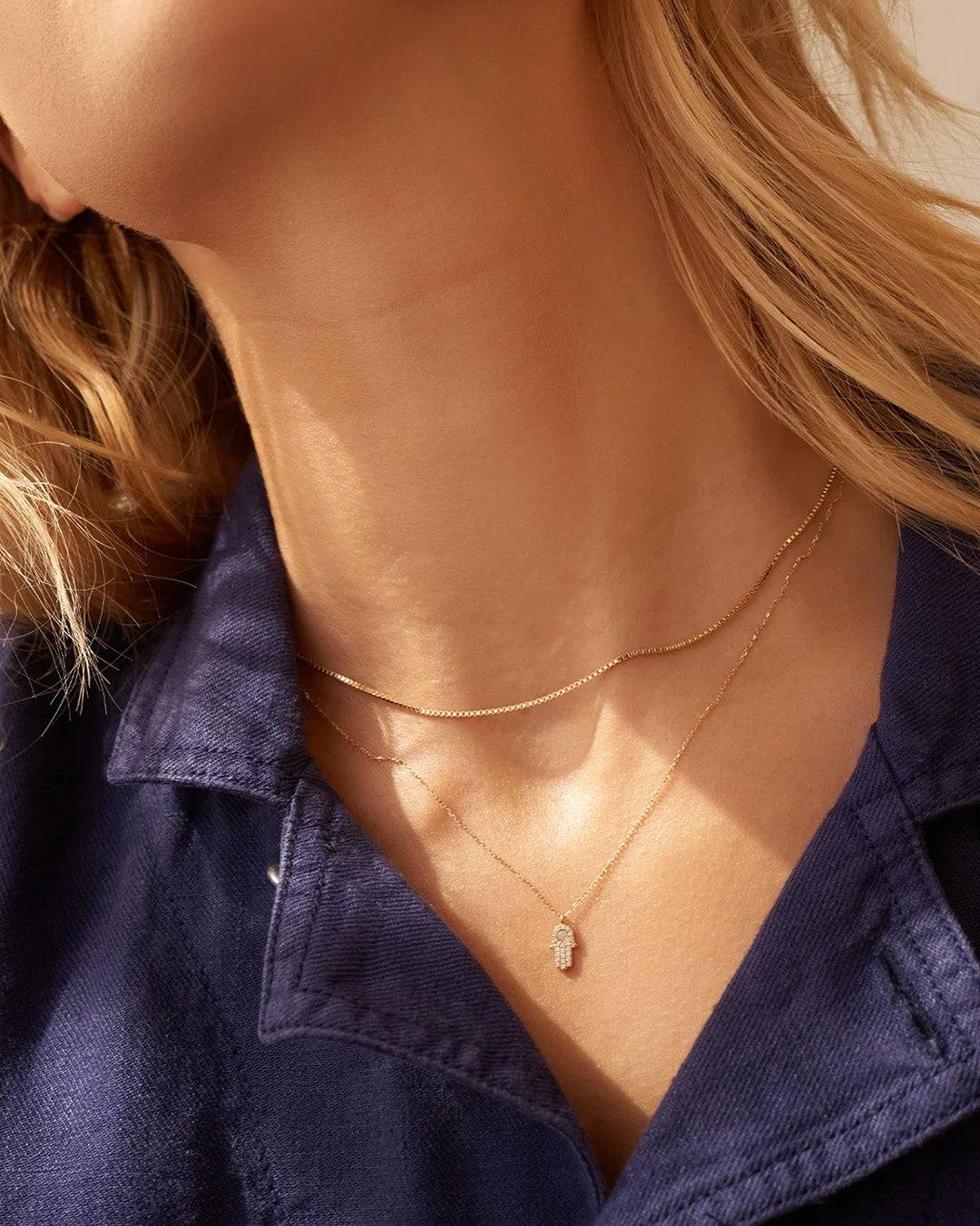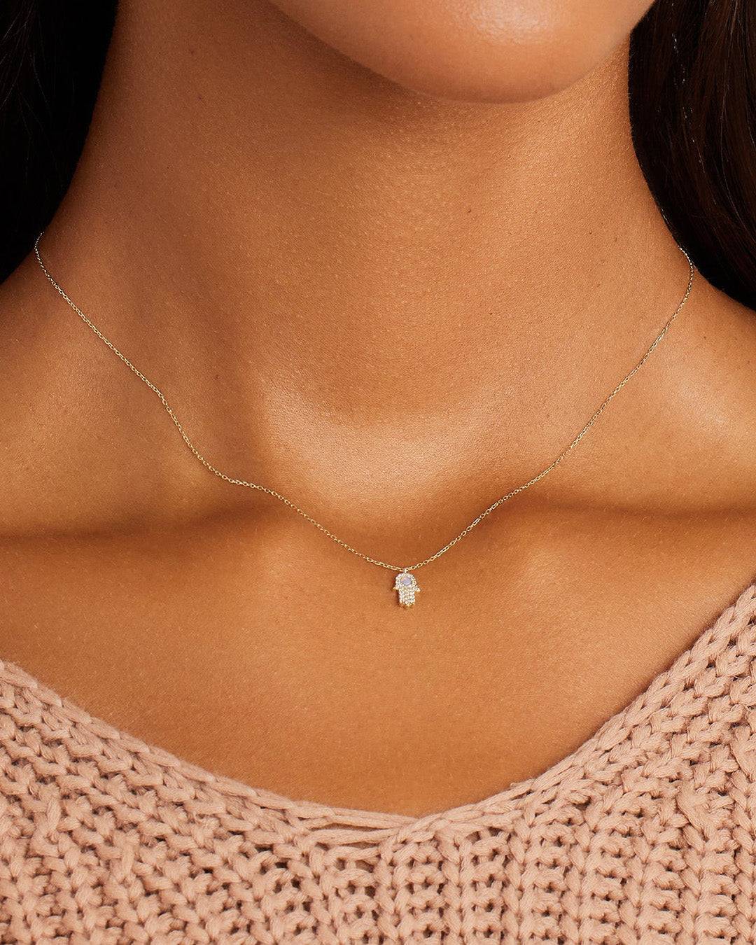 Boost your style with our stunning Diamond Hamsa Necklace. Featuring a beautiful diamond-studded Hamsa pendant, this necklace adds a touch of elegance to any look. Made with high-quality materials, it is perfect for any occasion. Elevate your collection today.