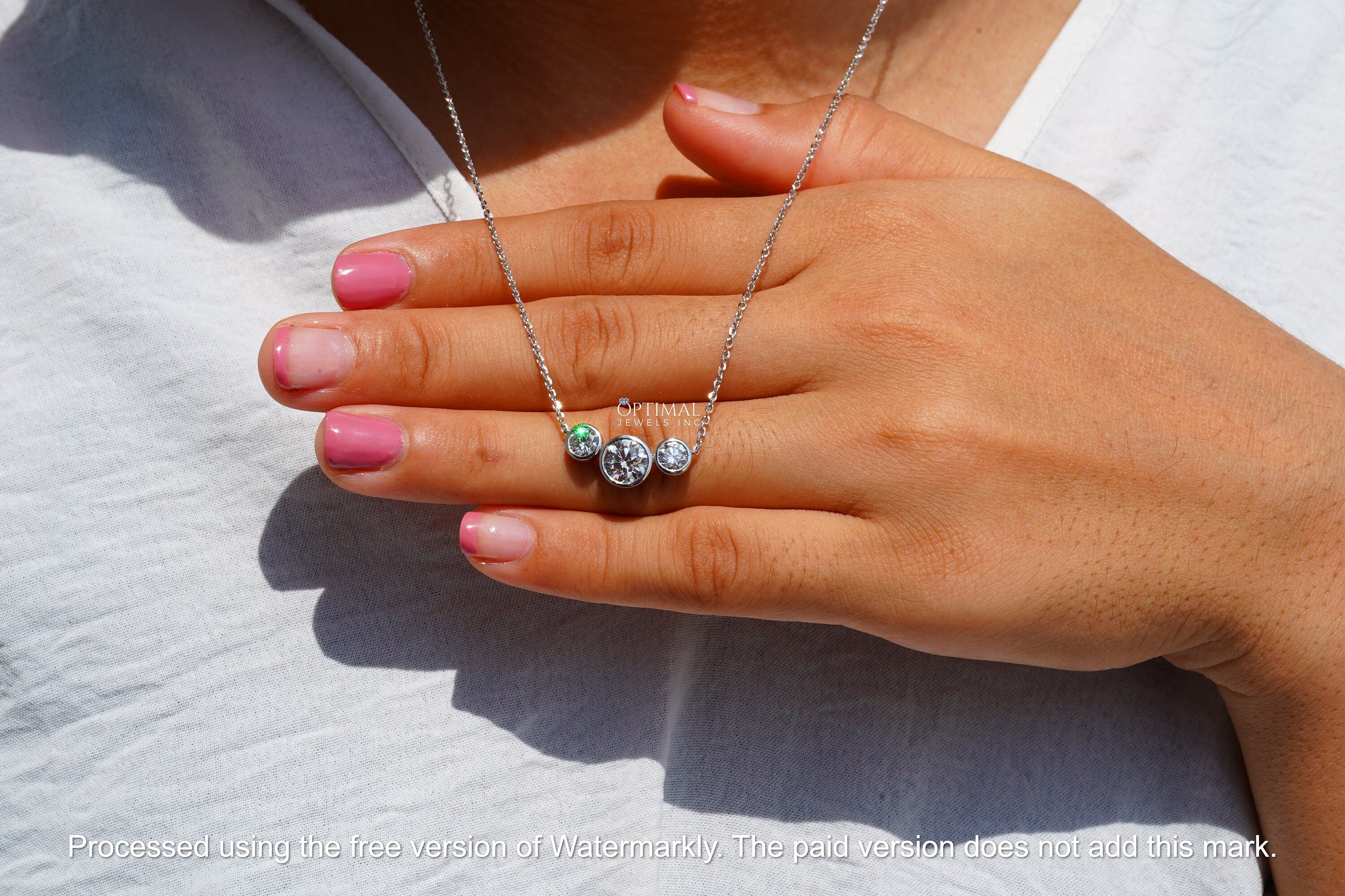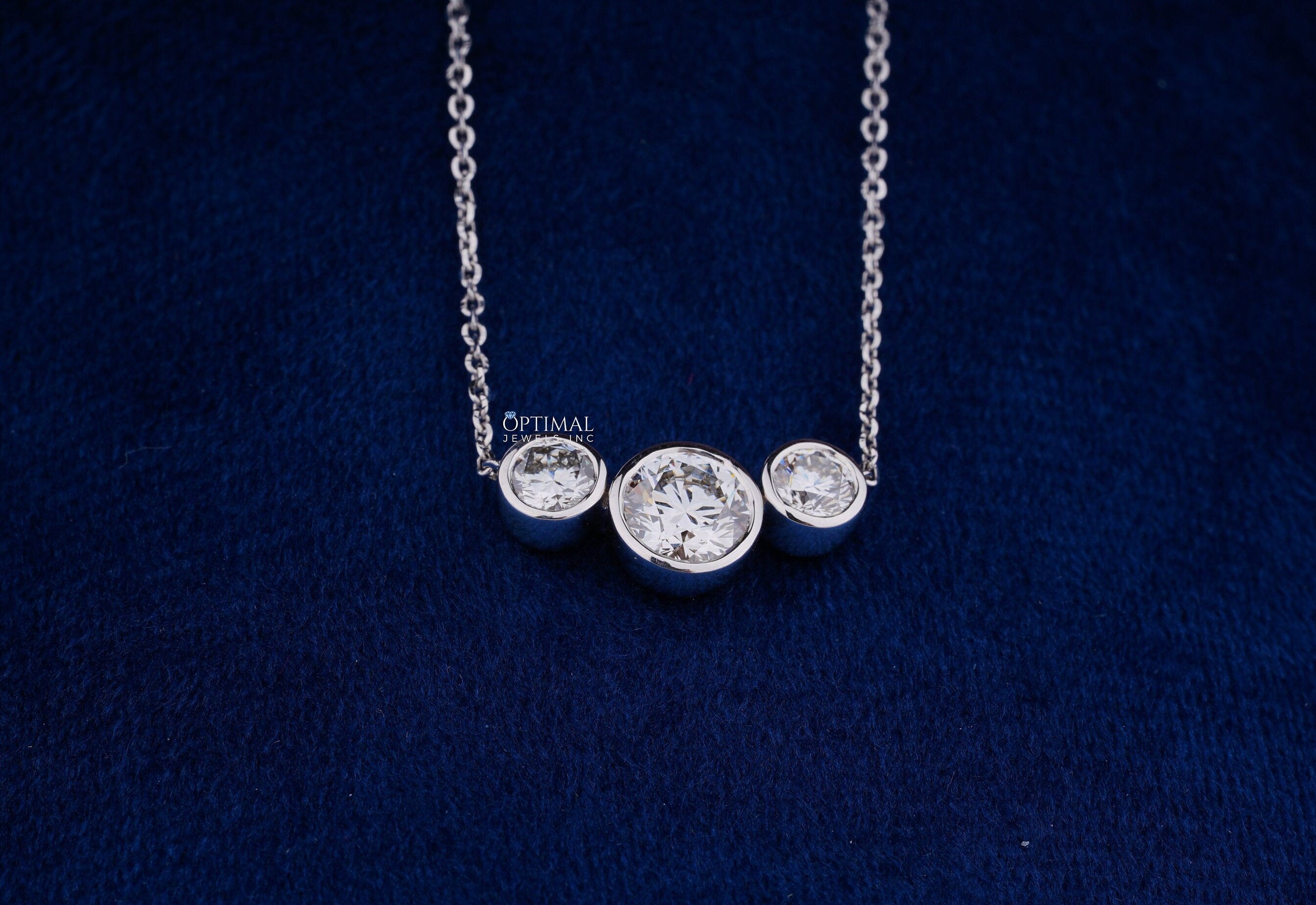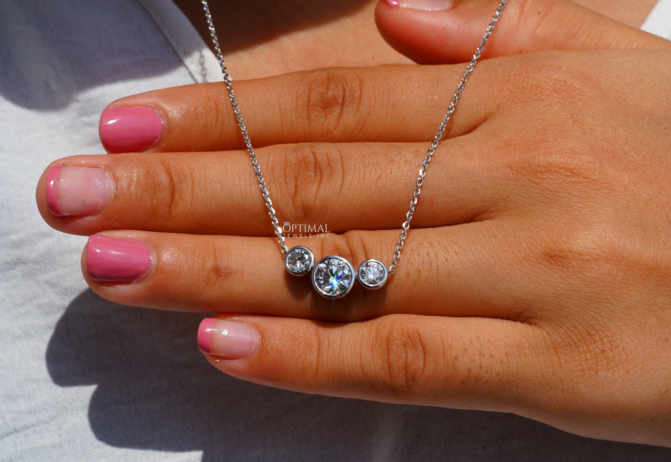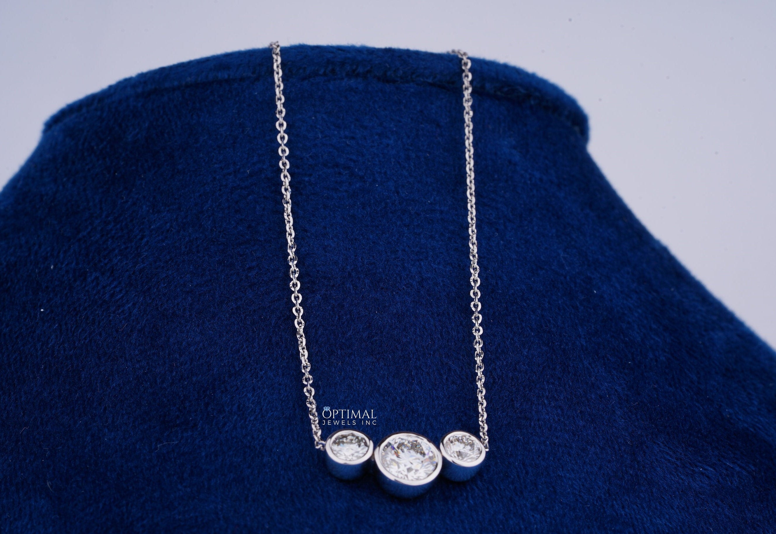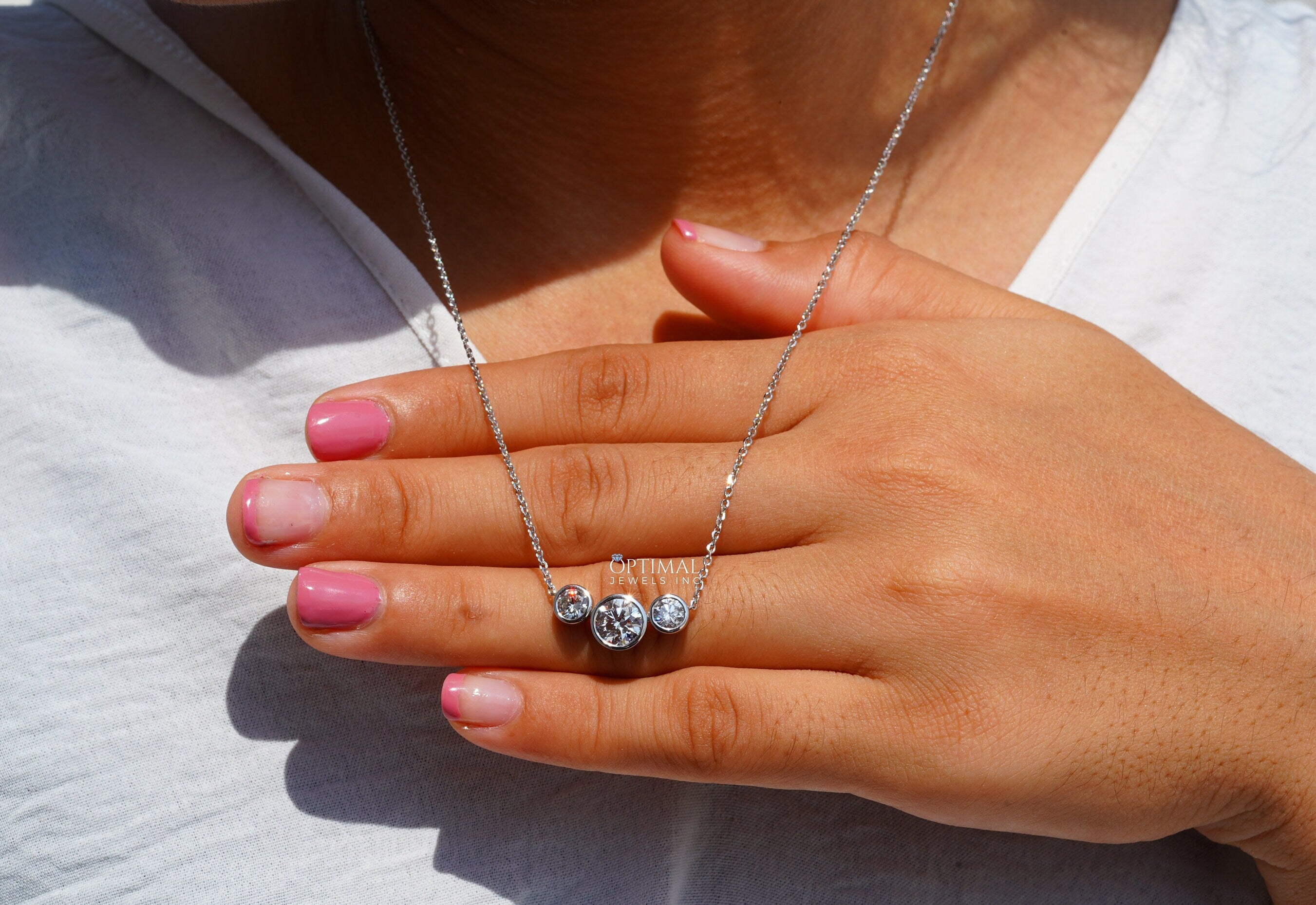 ફરસી સેટ વ્હાઇટ ગોલ્ડ નેકલેસ 2.05 CTW રાઉન્ડ કટ લેબમાં ઉગાડવામાં આવેલ ડાયમંડ પેન્ડન્ટ થ્રી સ્ટોન પેન્ડન્ટ, 18" રોલો ગોલ્ડ ચેઇન, તેના માટે જન્મદિવસની ભેટ