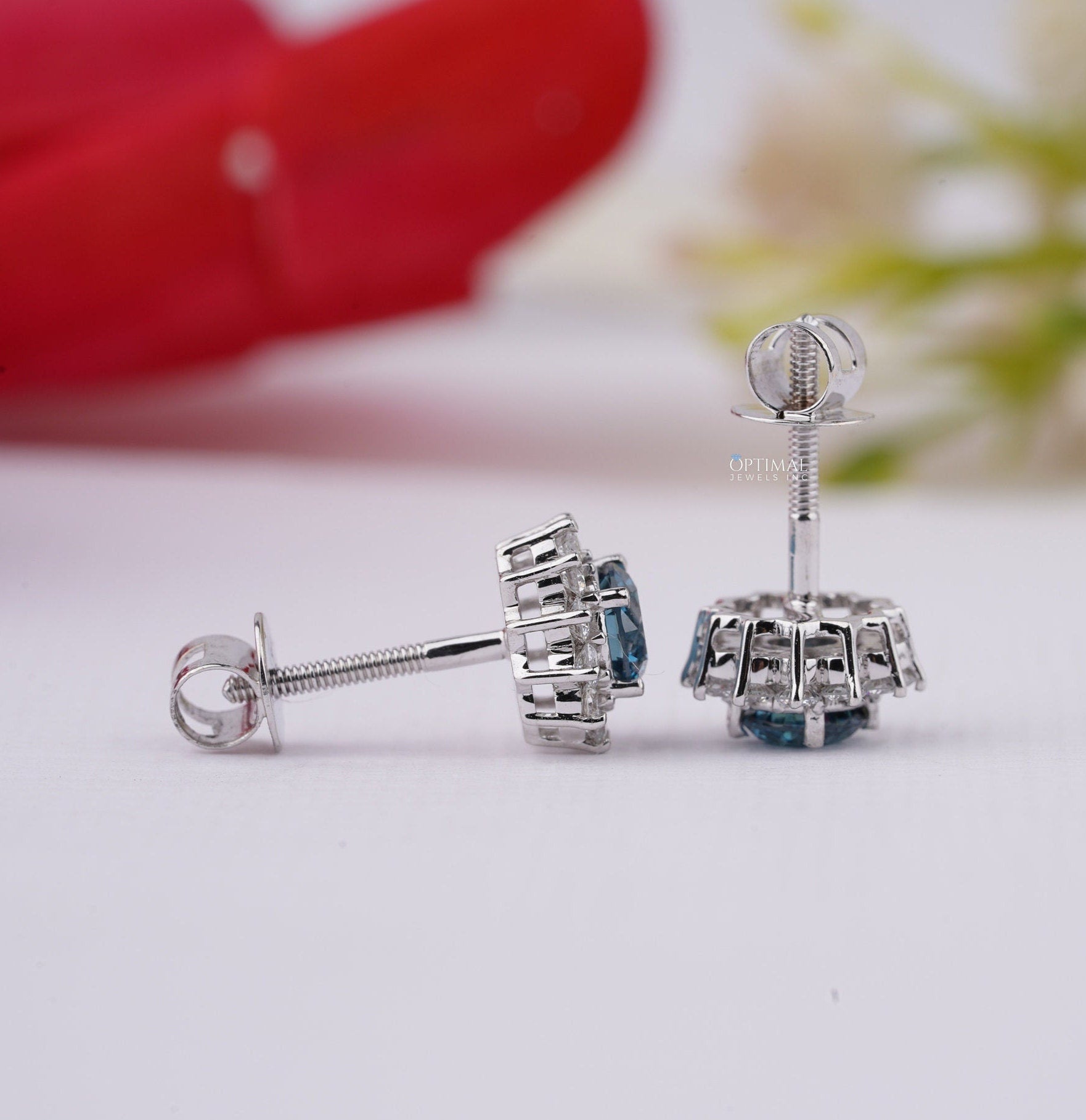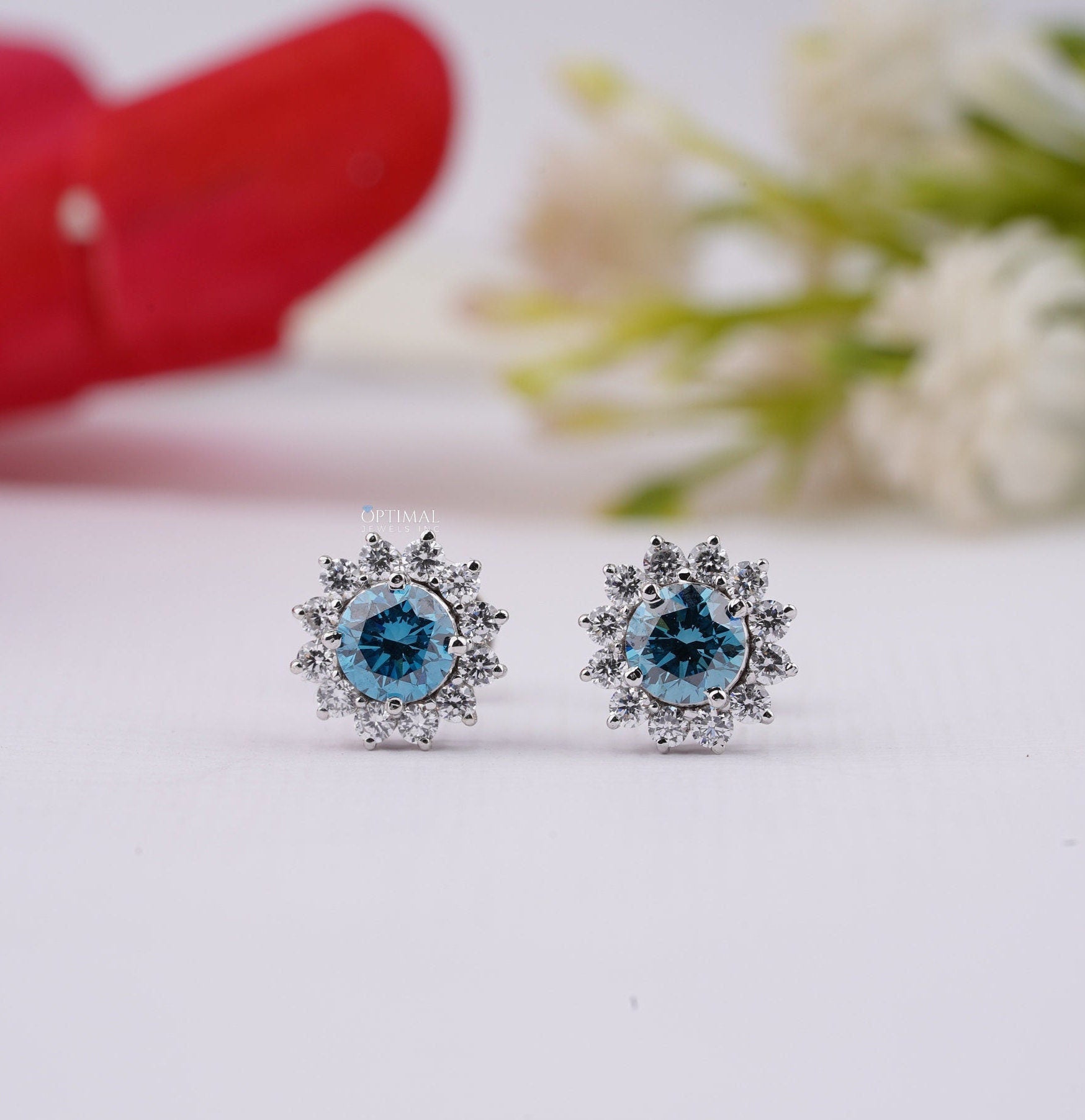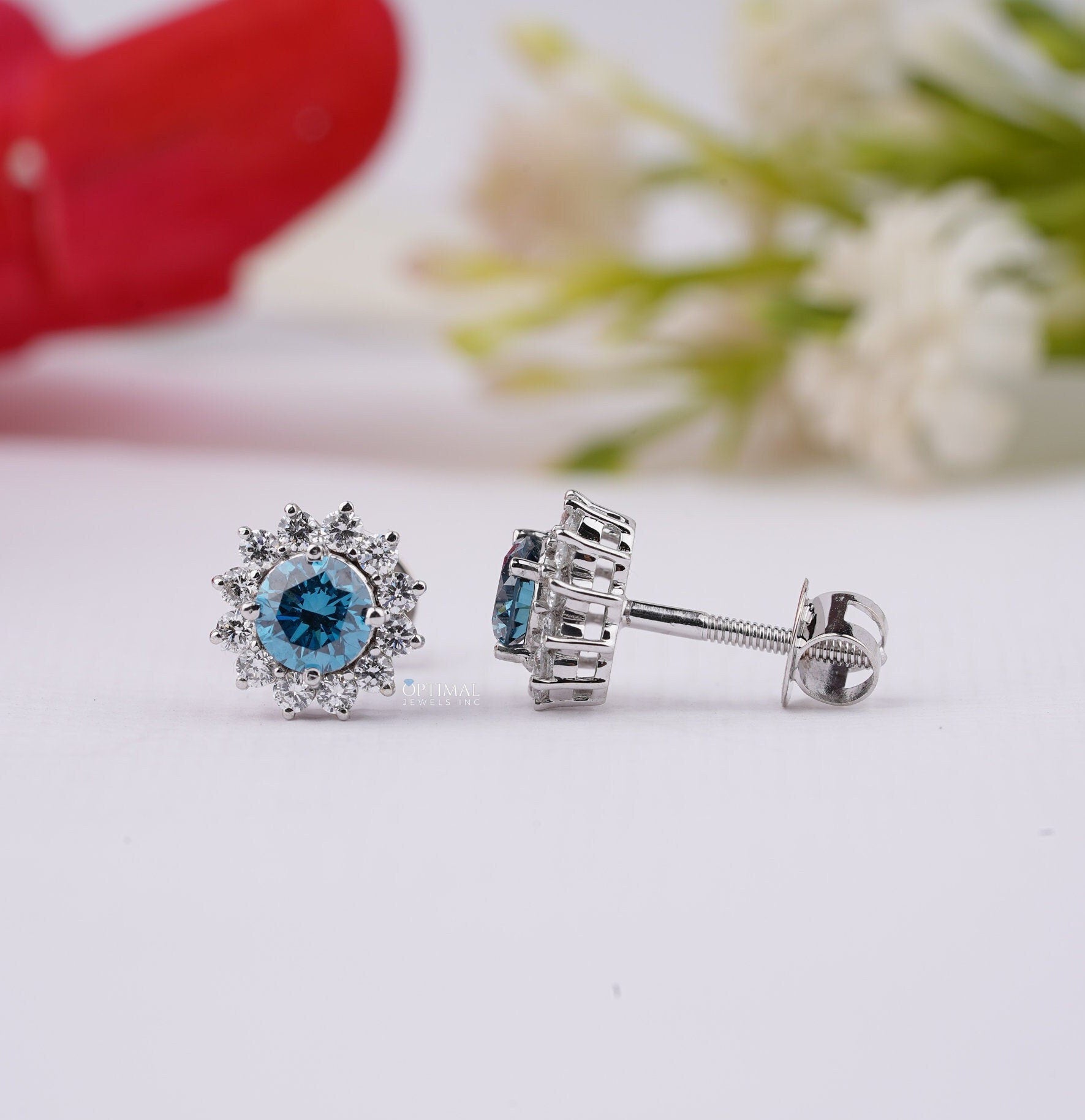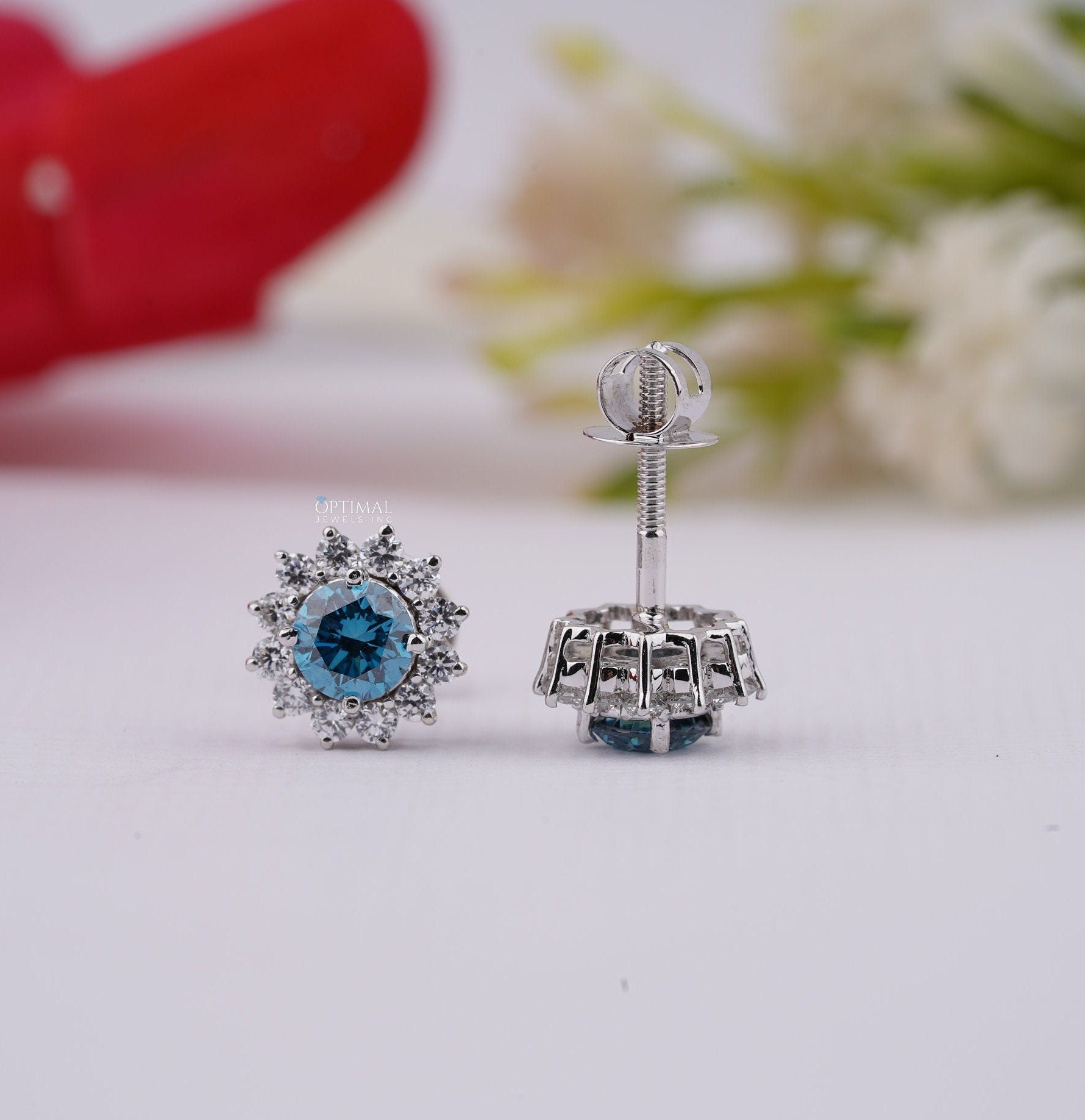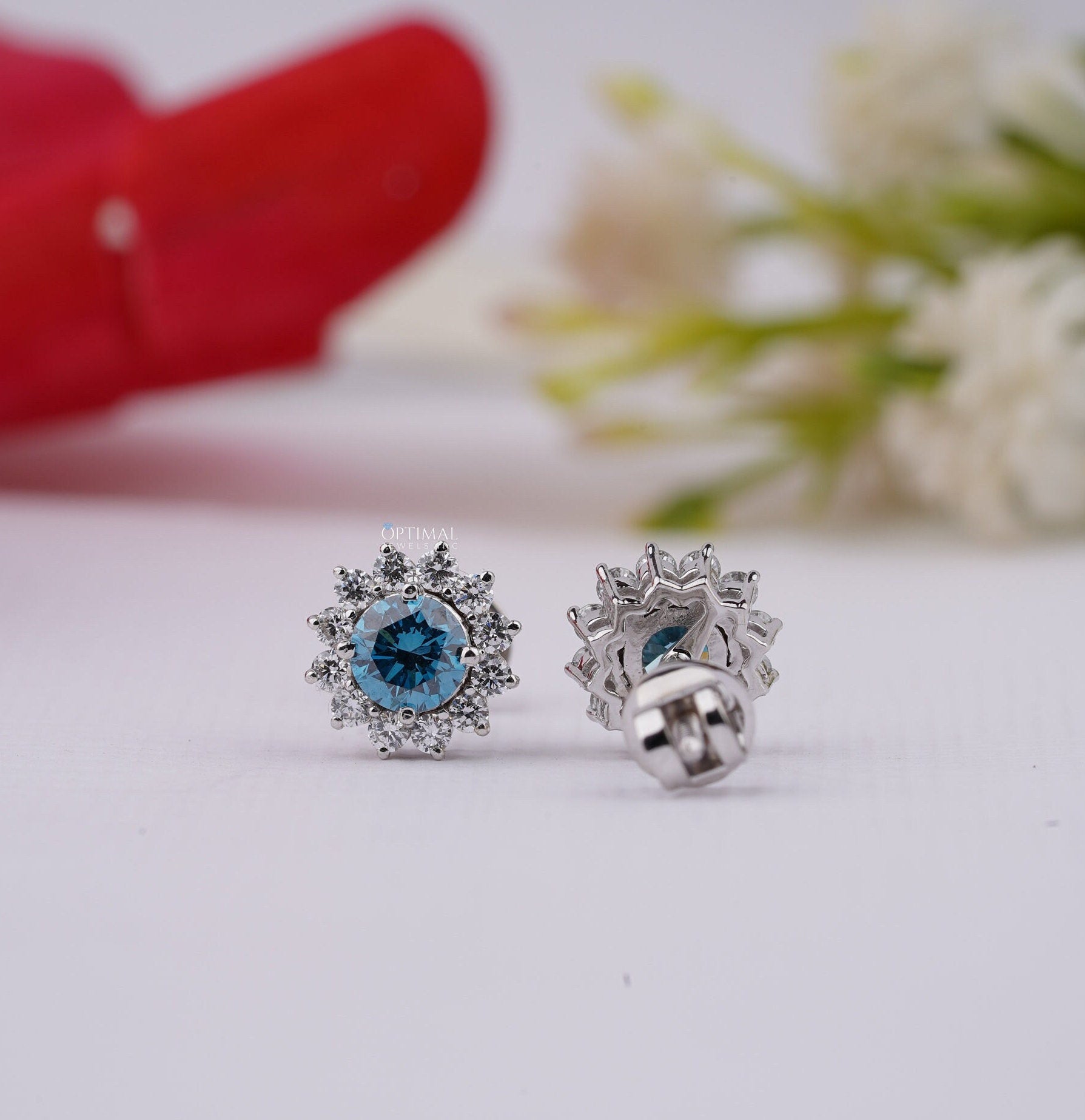 ફેન્સી વિવિડ બ્લુ લેબ ડાયમંડ ઇયરિંગ 2.50 Ctw હેલો ડાયમંડ ઇયરિંગ રાઉન્ડ કટ ડાયમંડ વ્હાઇટ ગોલ્ડ સ્ટડ ઇયરિંગ તેના માટે રોજિંદા પહેરવા માટે ભેટ