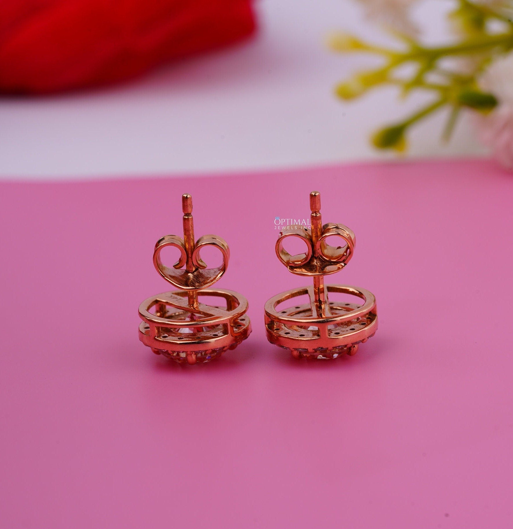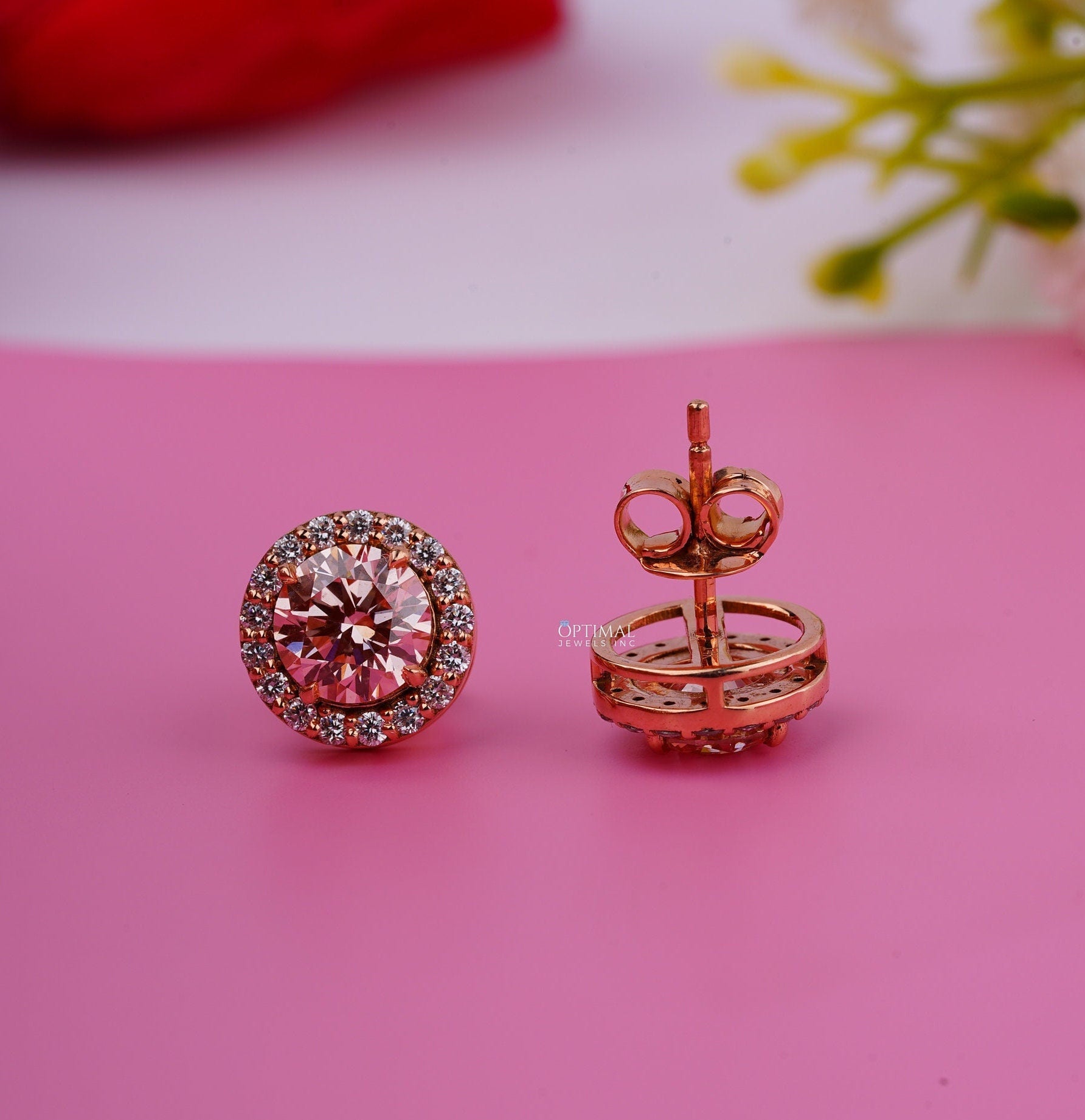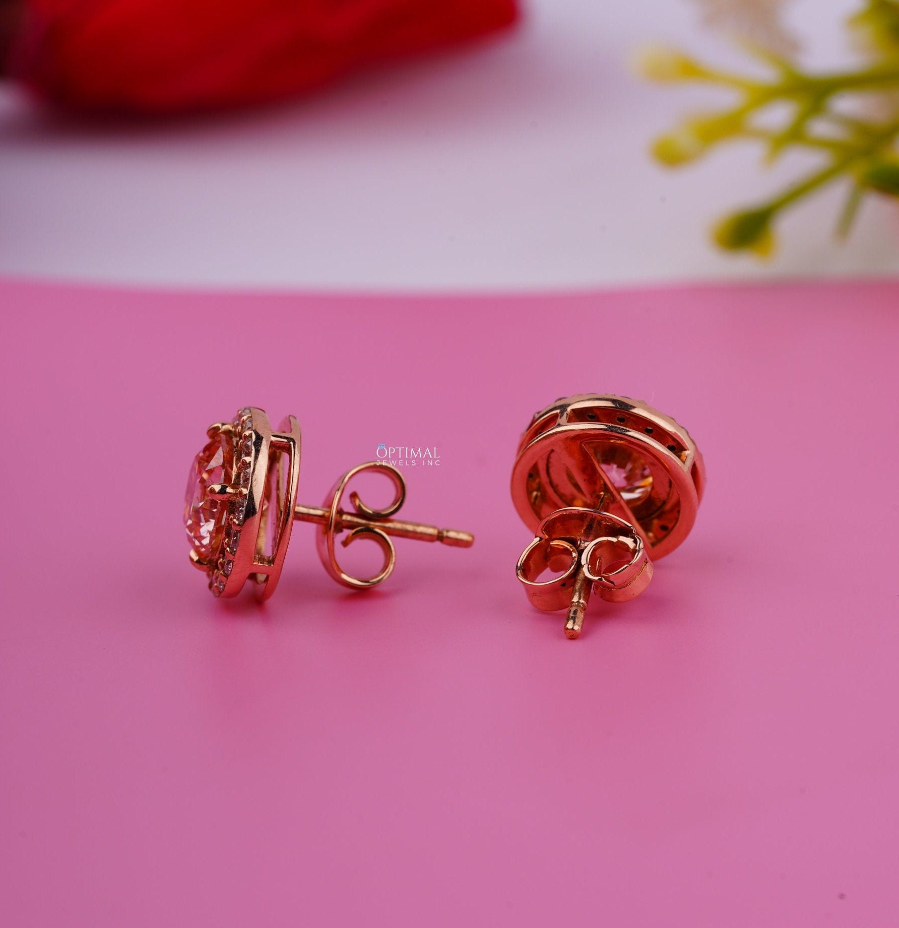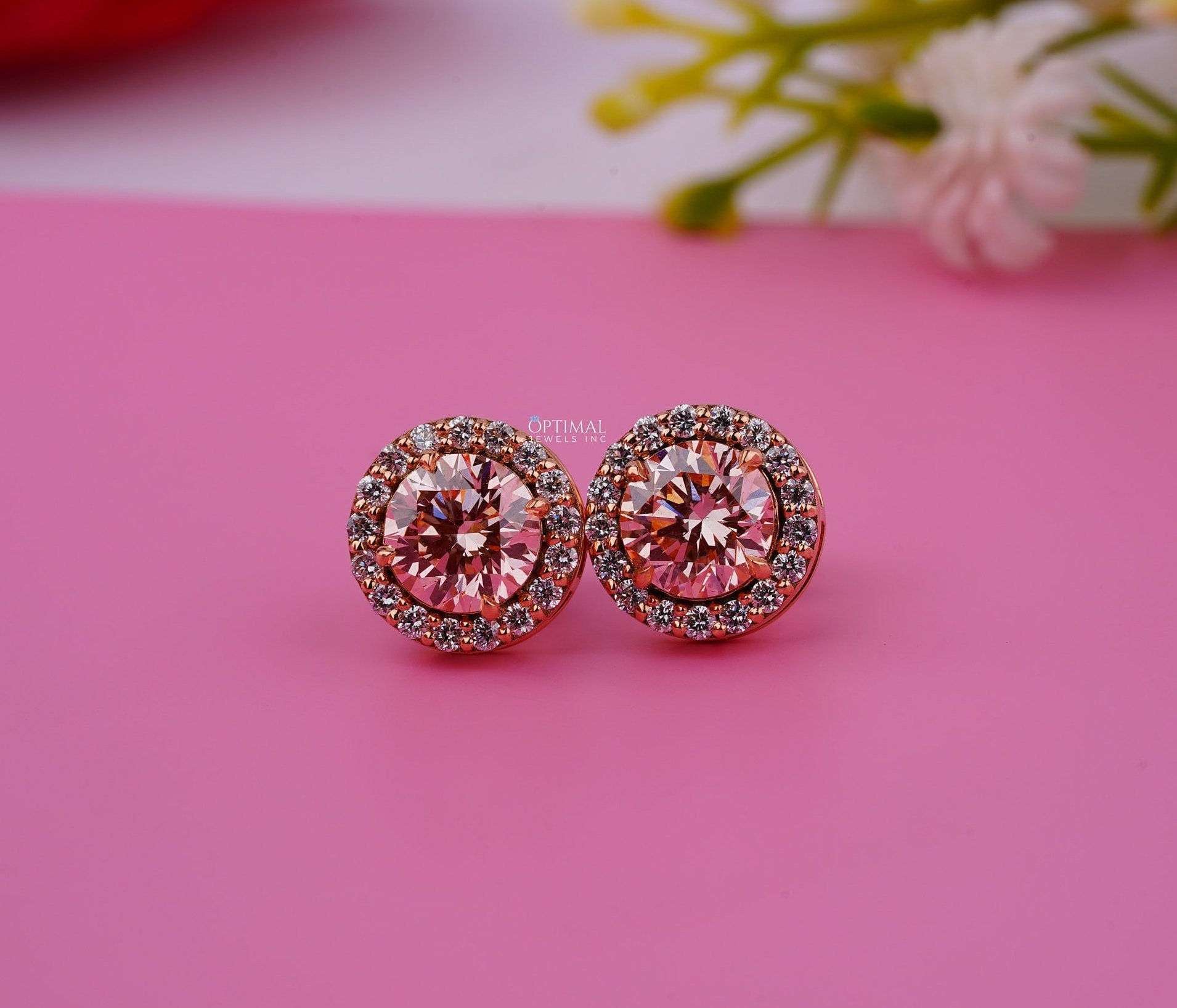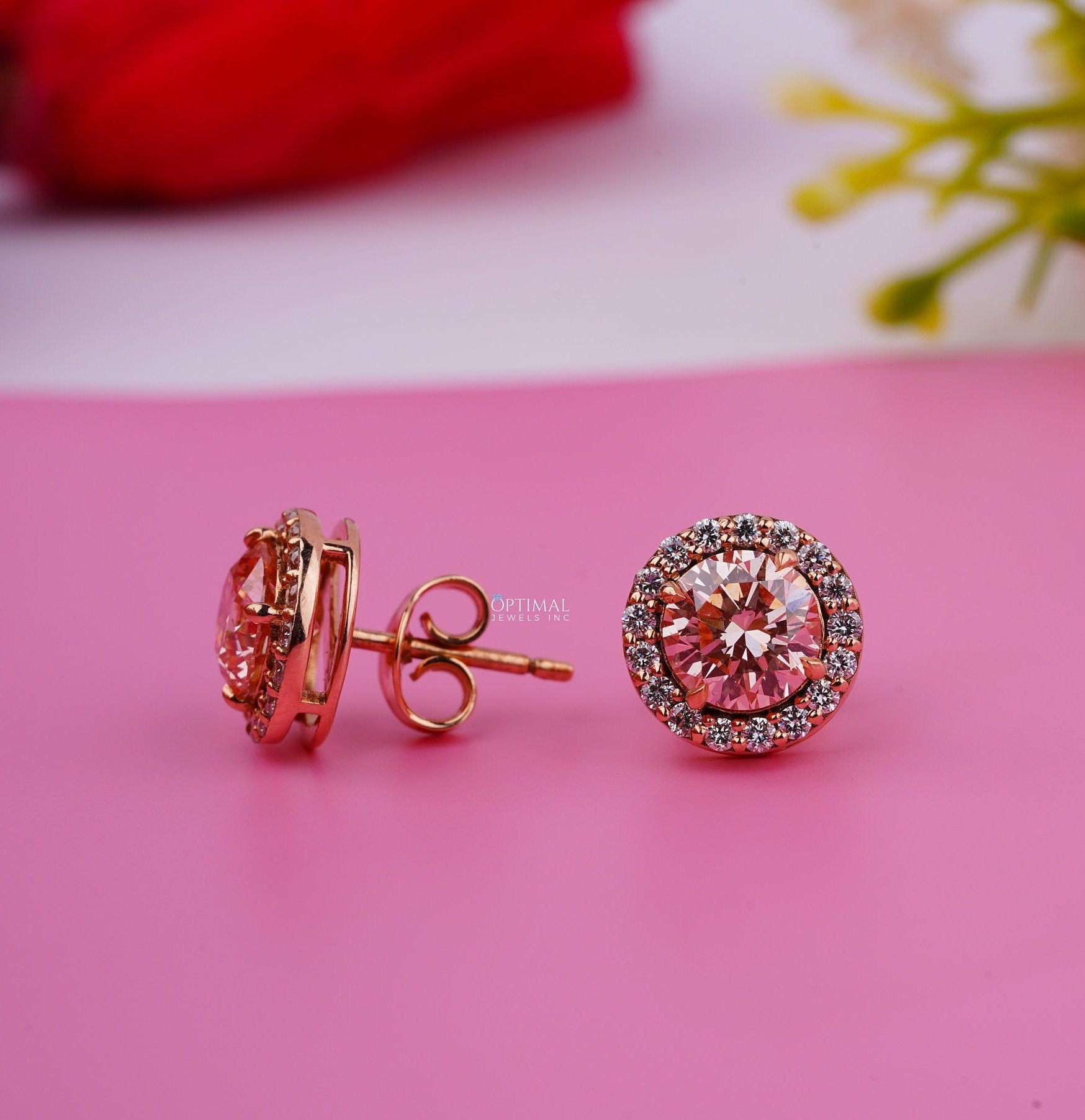 પિંક રાઉન્ડ લેબ ડાયમંડ ઇયરિંગ્સ 2.40 Ctw IGI સર્ટિફાઇડ હેલો ડાયમંડ ઇયરિંગ 18K યલો ગોલ્ડ સ્ટડ ઇયરિંગ મહિલાઓ માટે તેણીની પરફેક્ટ ભેટ માટે