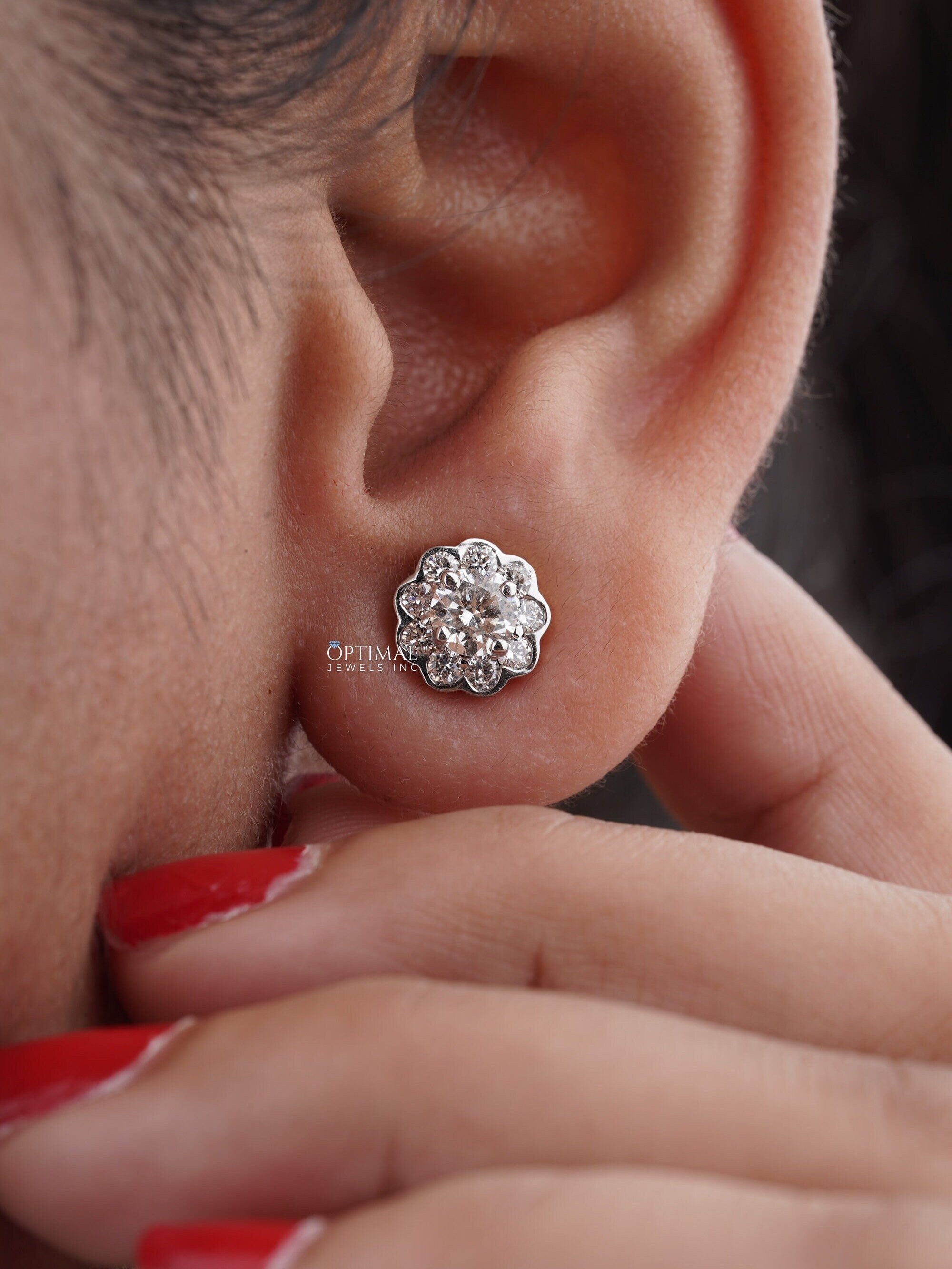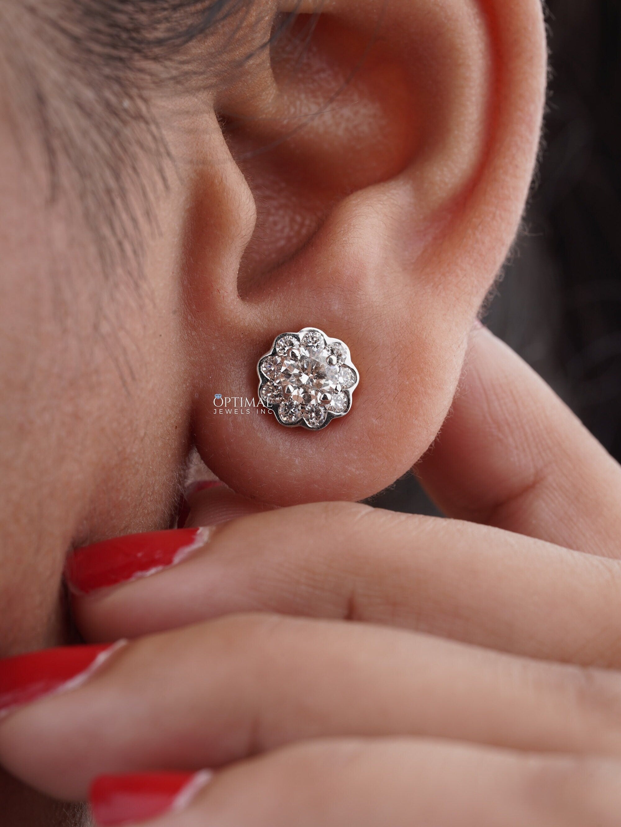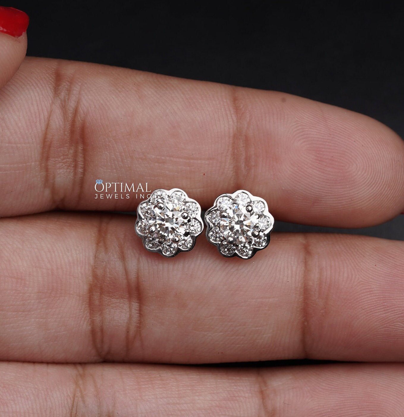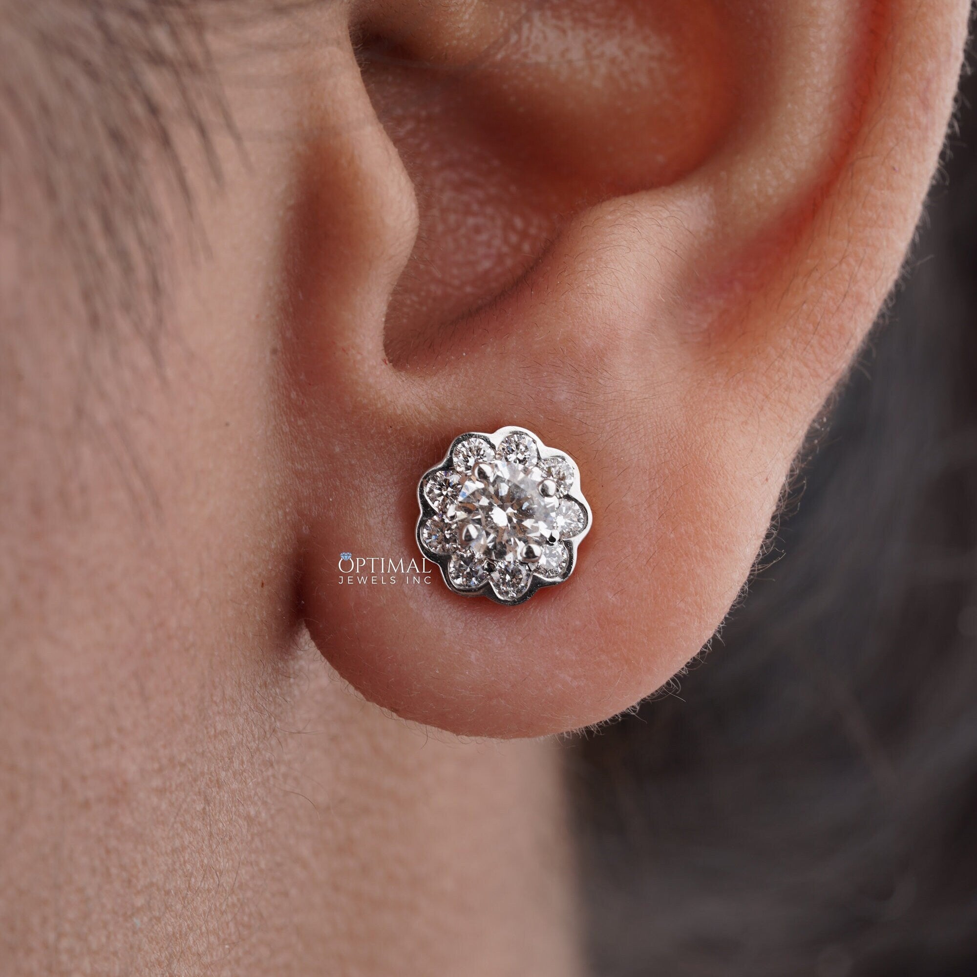 ગોળાકાર લેબ-ગ્રોન ડાયમંડ ઇયરિંગ્સ, 2 CTW ક્લસ્ટર ફ્લાવર શેપ સ્ટડ ઇયરિંગ, સ્ક્રુ બેક યલો ગોલ્ડ ઇયરિંગ, મિનિમેલિસ્ટ ડિઝાઇન, મહિલાઓ માટે ભેટ