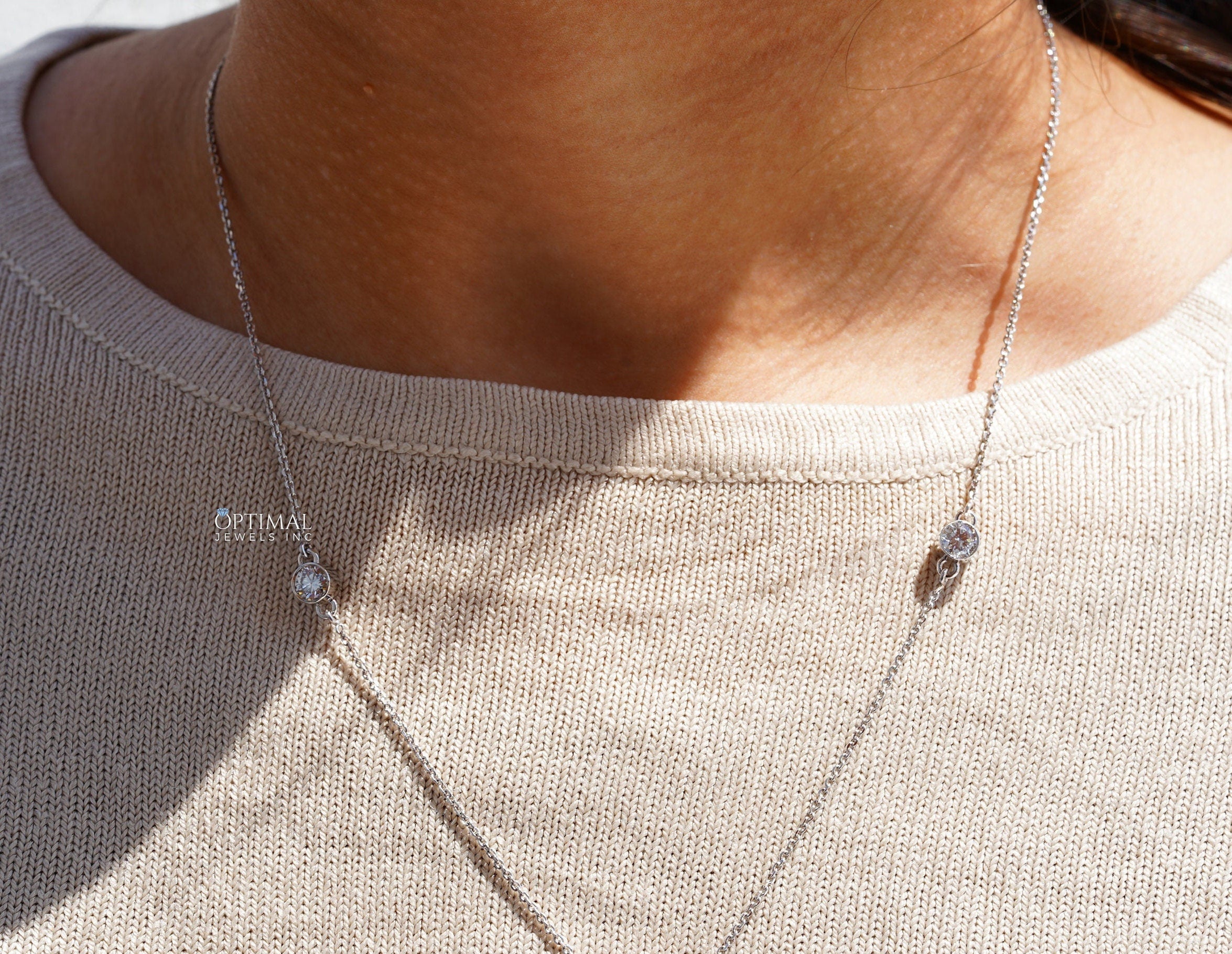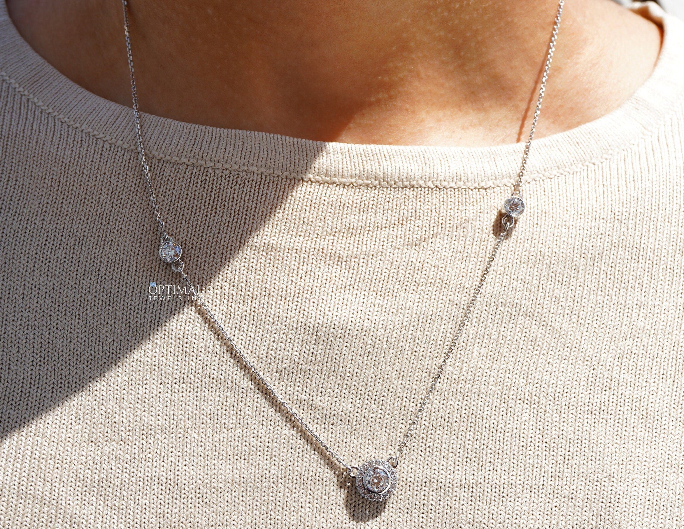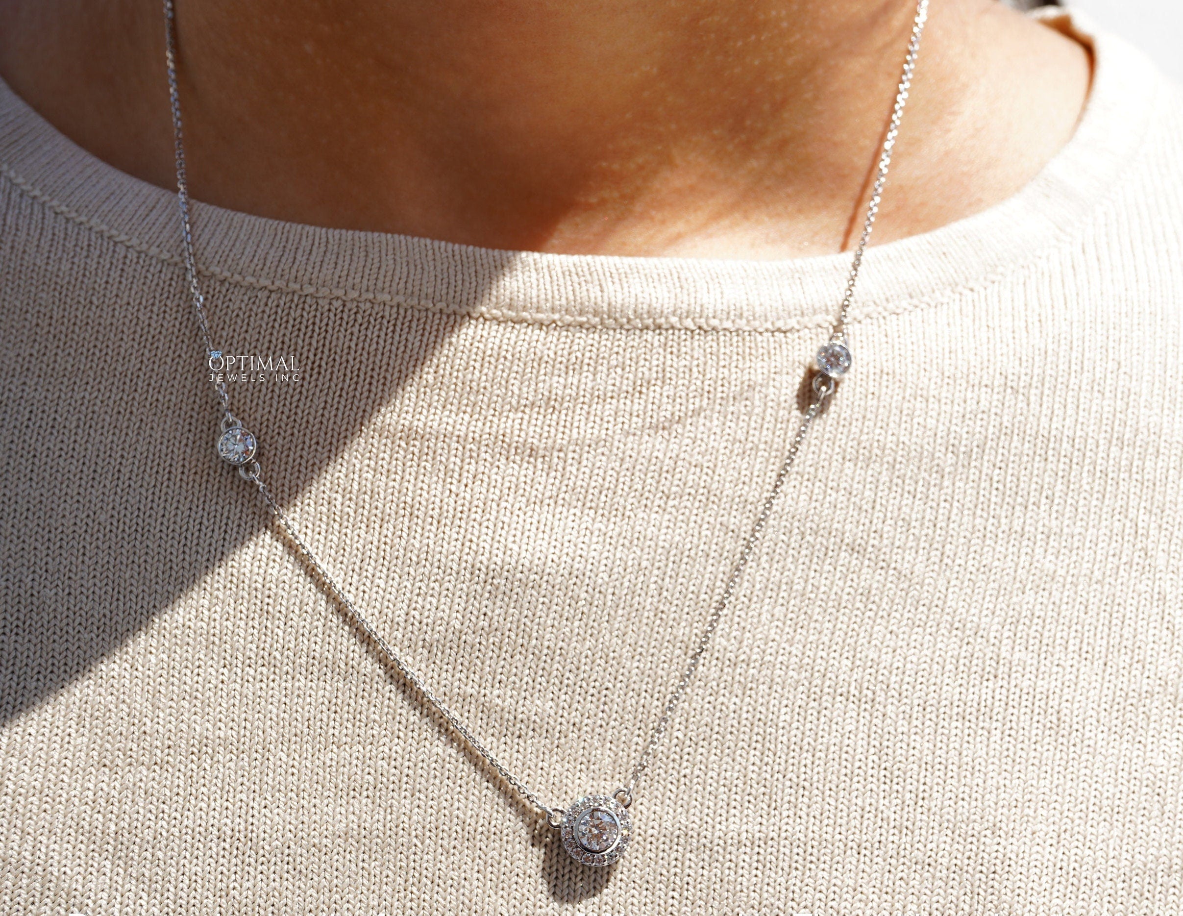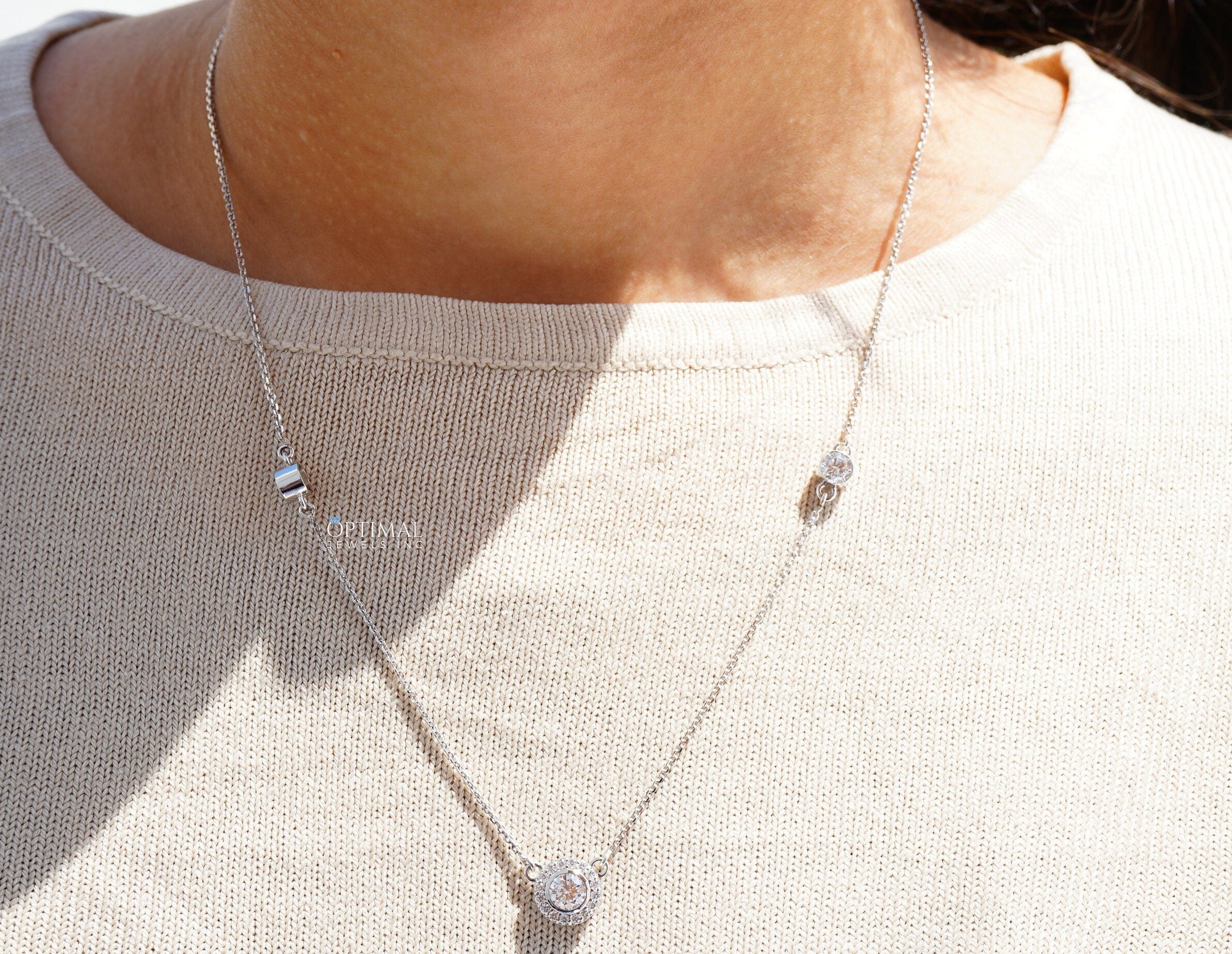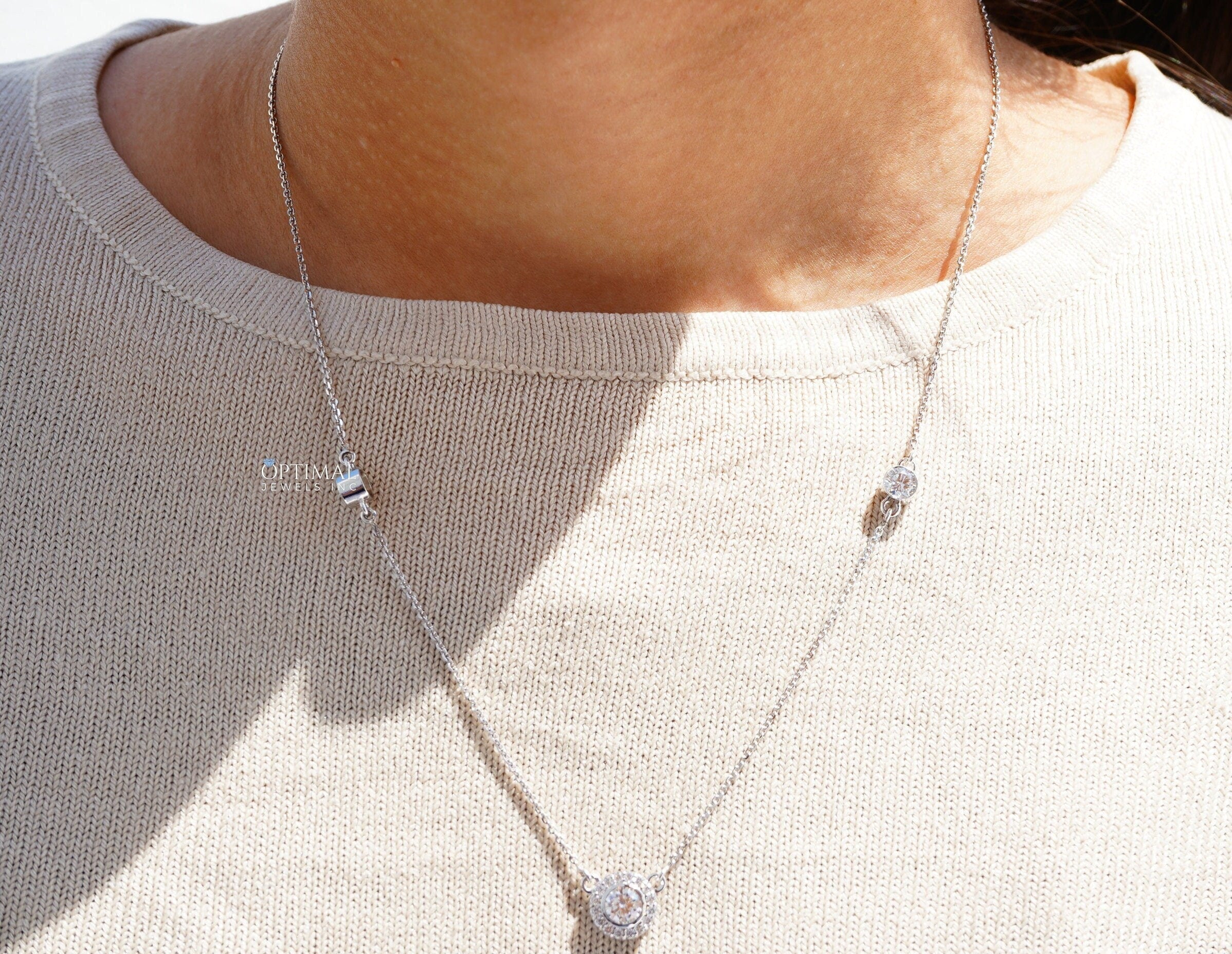 ટ્રિપલ સ્ટોન લેબ ડાયમંડ નેકલેસ 1.00 CTW રાઉન્ડ કટ હેલો ડાયમંડ પેન્ડન્ટ, ફરસી સેટ વ્હાઇટ ગોલ્ડ ચેઇન પેન્ડન્ટ, તેના માટે પરફેક્ટ બર્થડે ગિફ્ટ