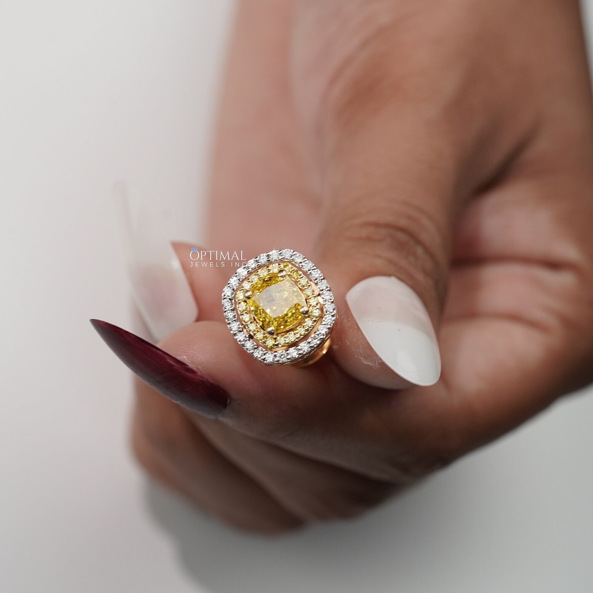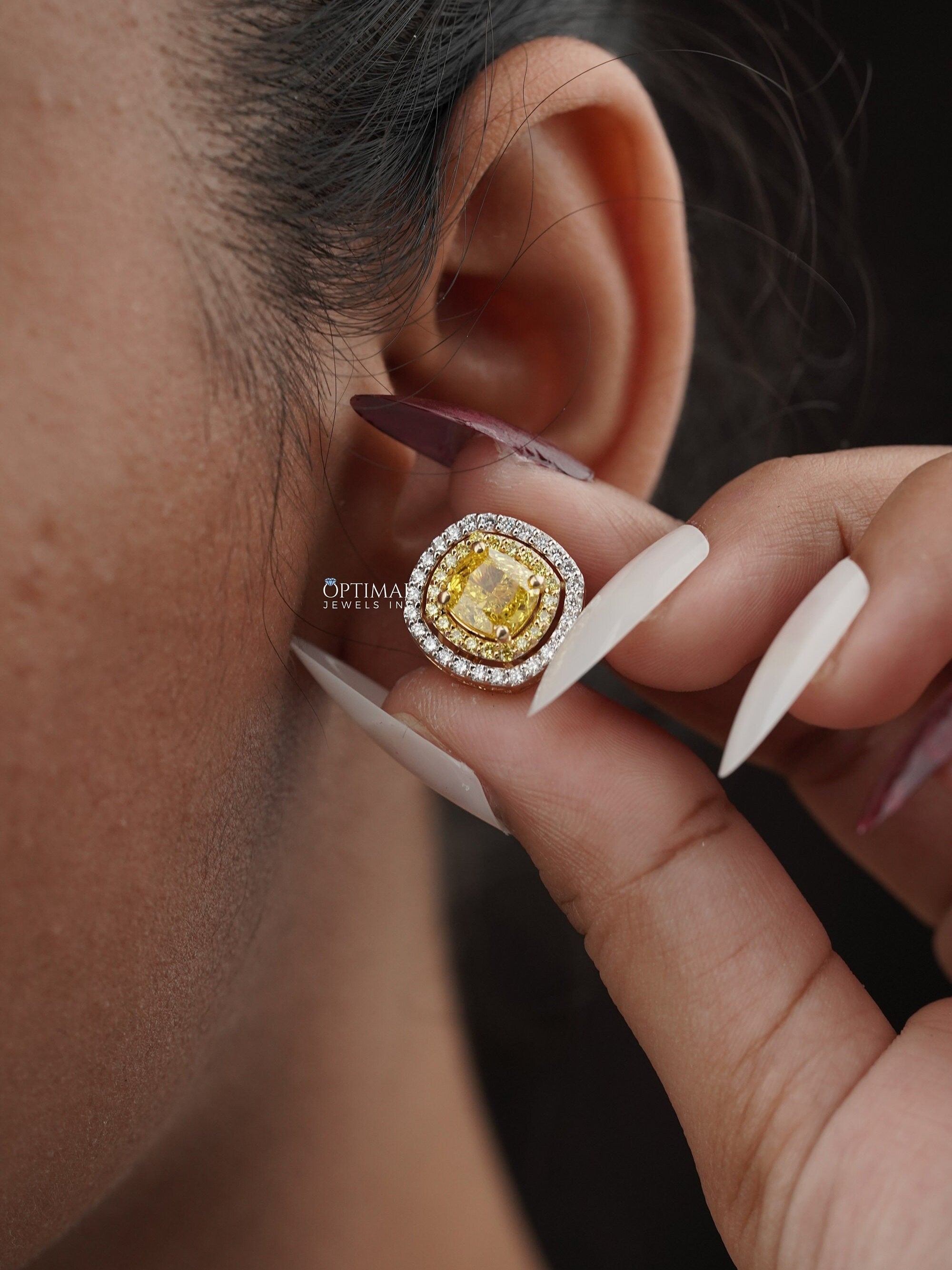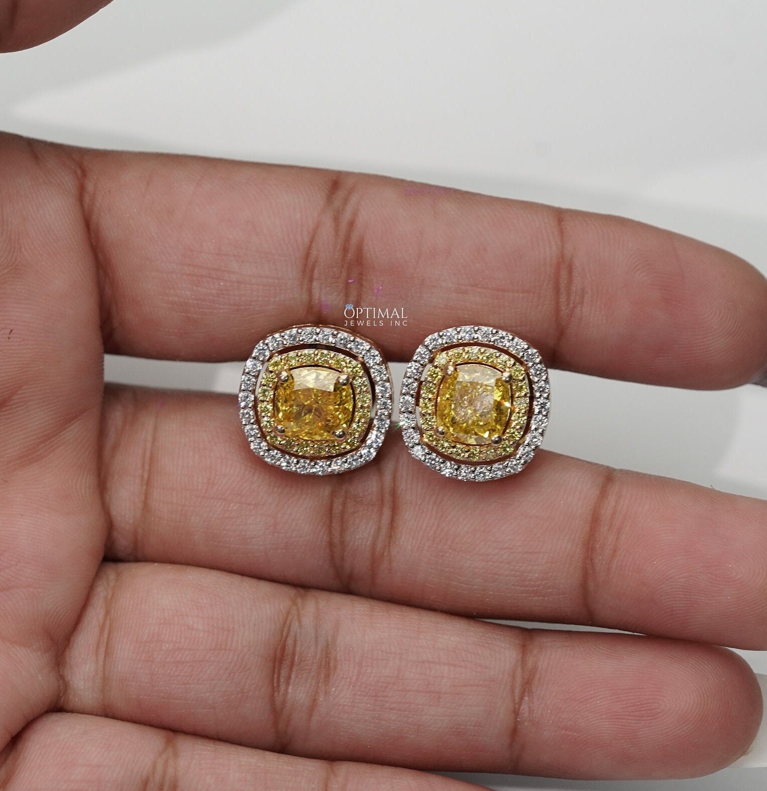 યુનિક કુશન લેબ ગ્રોન ડાયમંડ ઇયરિંગ 3.50 Ctw ડબલ હેલો ડાયમંડ ઇયરિંગ 18K ગોલ્ડ વેડિંગ એરિંગ યલો ડાયમંડ સ્ટડ ઇયરિંગ મહિલાઓ માટે