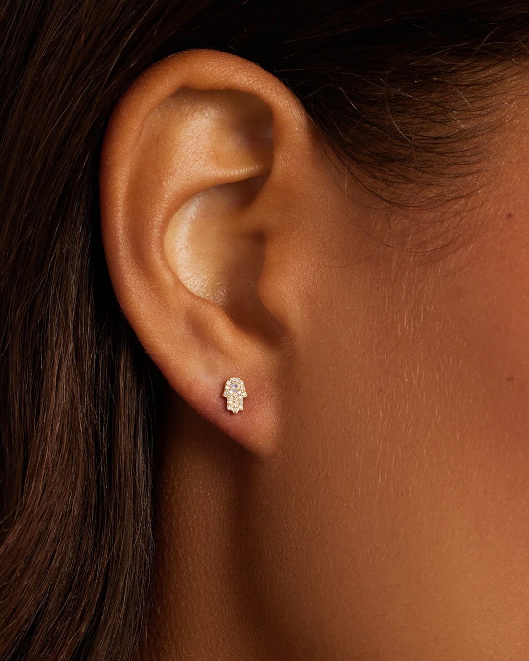 These Diamond Hamsa Studs are an elegant and meaningful addition to any jewelry collection. Made with sparkling diamonds, these studs not only add a touch of glamour but also symbolize protection and good fortune. Perfect for any occasion, these studs are a unique and stylish way to express your faith and personal style.