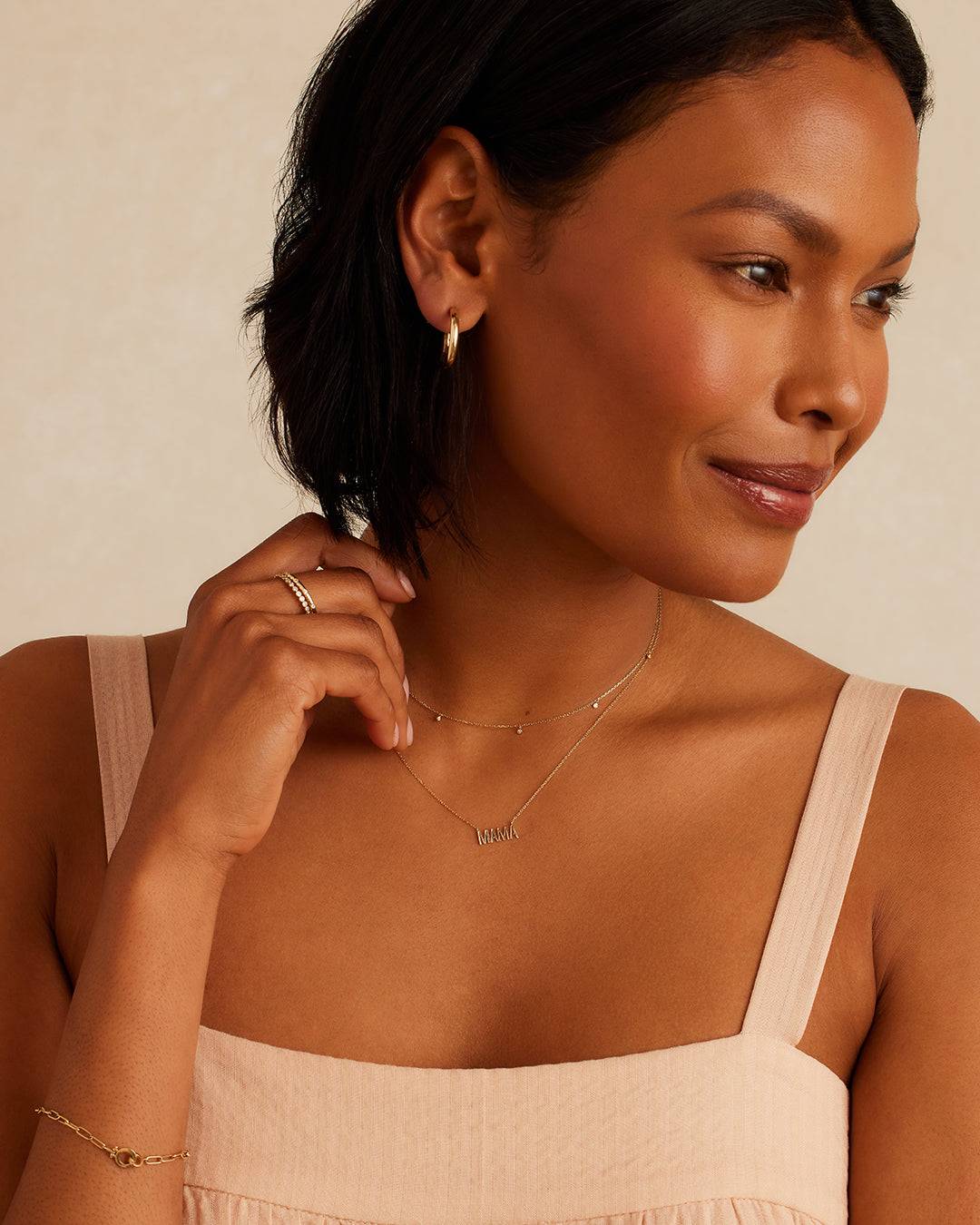 This 14k gold Mama necklace is a timeless and elegant accessory for any mother. Made from high-quality materials, it is the perfect way to showcase your love and appreciation for the special bond between a mother and child. With its stunning design and durable construction, this necklace is sure to be cherished for years to come.